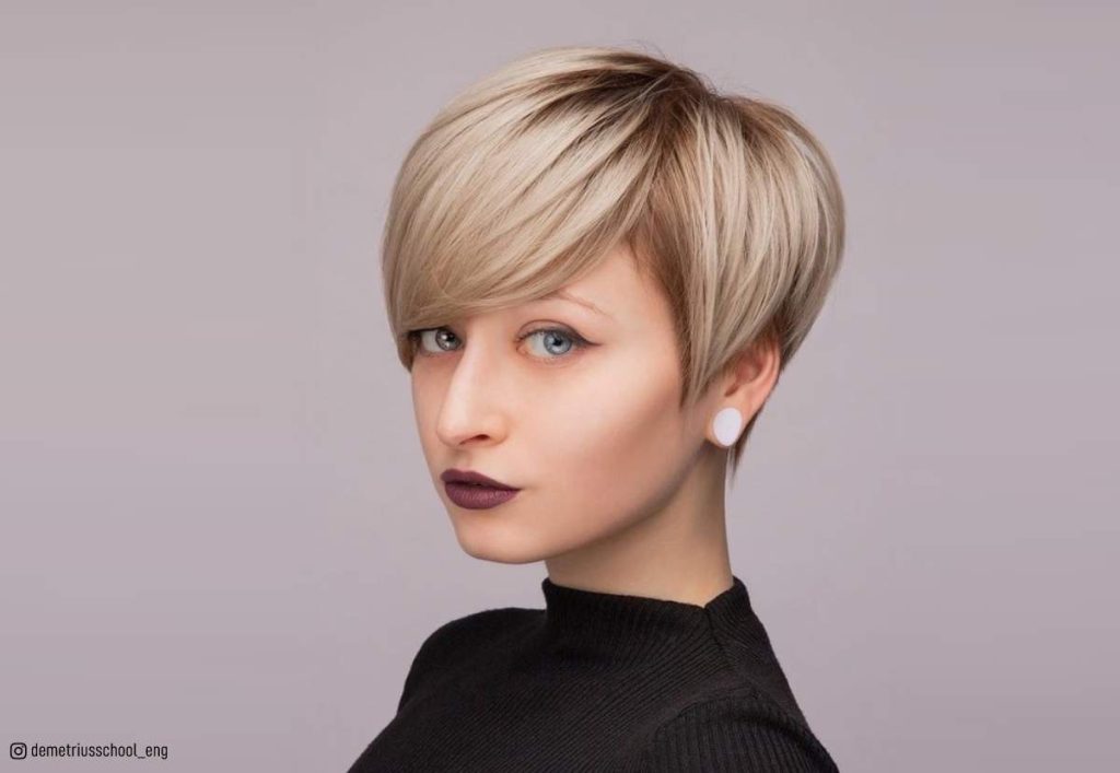 This clever pixie is very feminine and suitable for fine-haired women who like to sport thicker and more modern blonde styles. Unlike dark roots, a long layer with no height at the top creates the feel of thick hair and is ideal for elongated or oval facial shapes.